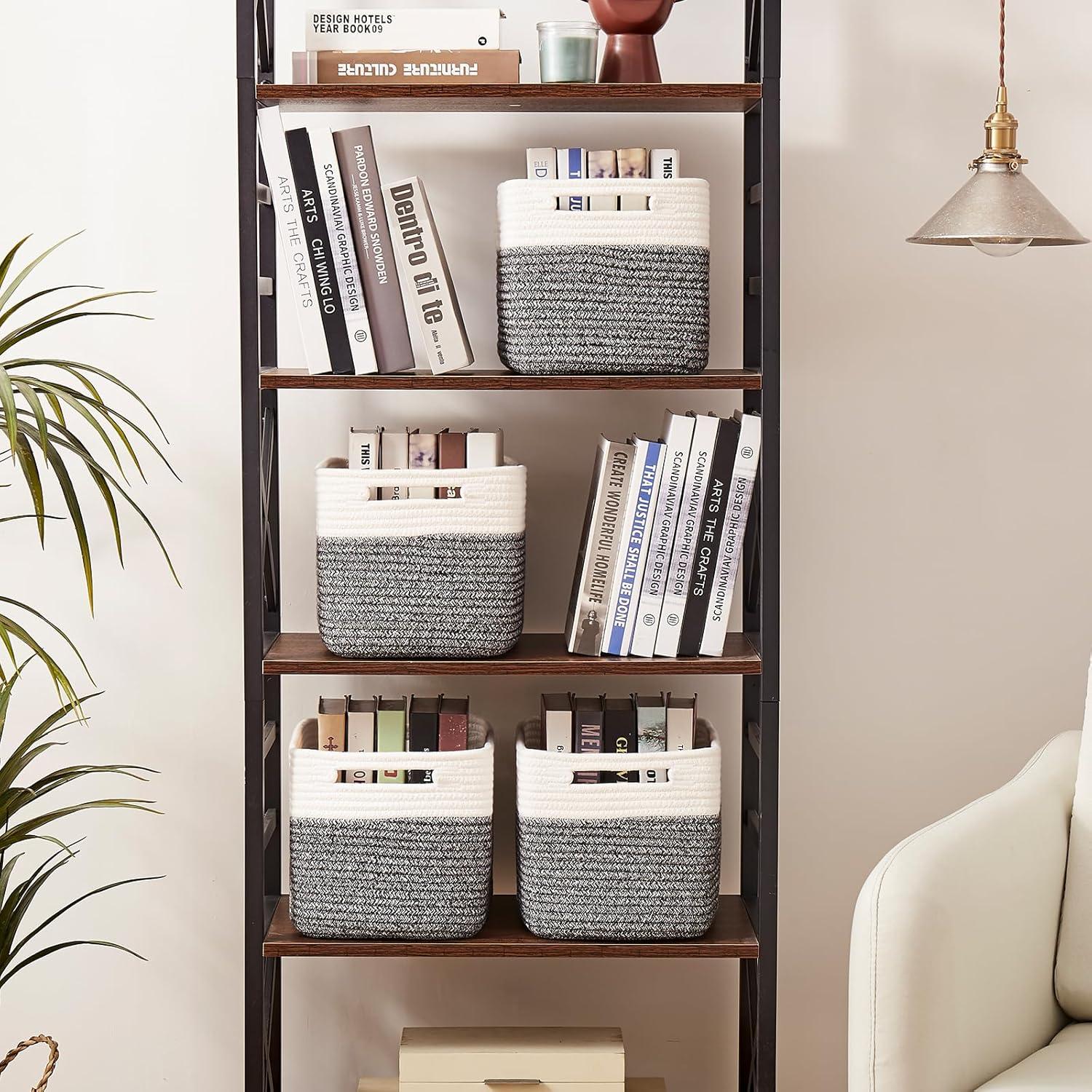 OIAHOMY 4 Pack Storage Baskets for Organizing, Basket for Shelves with Handle, Woven Baskets for Storage Toys, Towels, Books, Cotton Rope Basket 13″ L x 9 ” W x 7.8 ” H, Brown & White(Black & White)