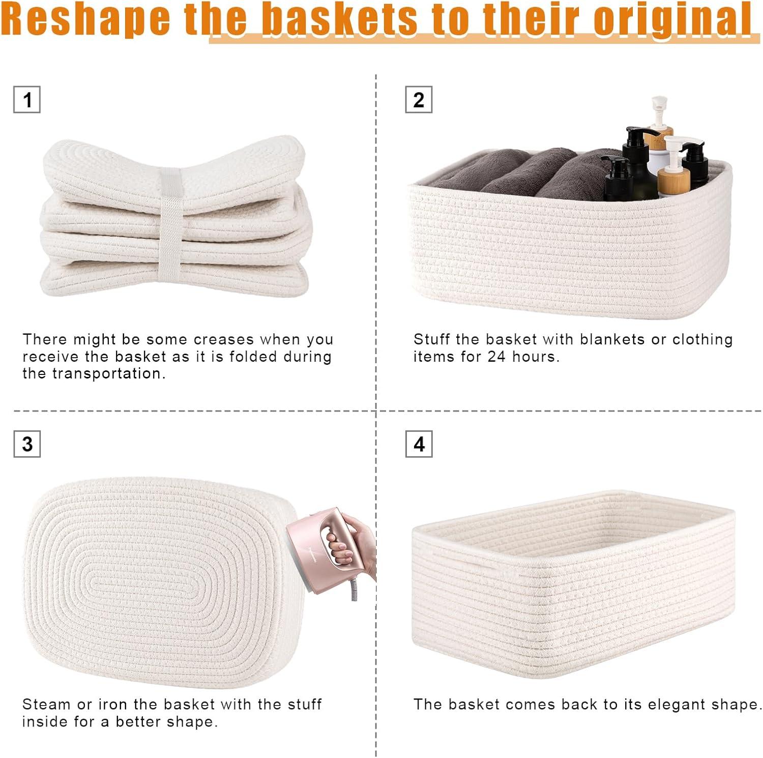 Note: OIAHOMY organizer baskets are folded for shipping. It will turn back to its elegant shape quickly by filling it with towels or blankets, and ironing is a great idea to regain the creases. Also, you can fold it into a flat shape for easy storage when not in use