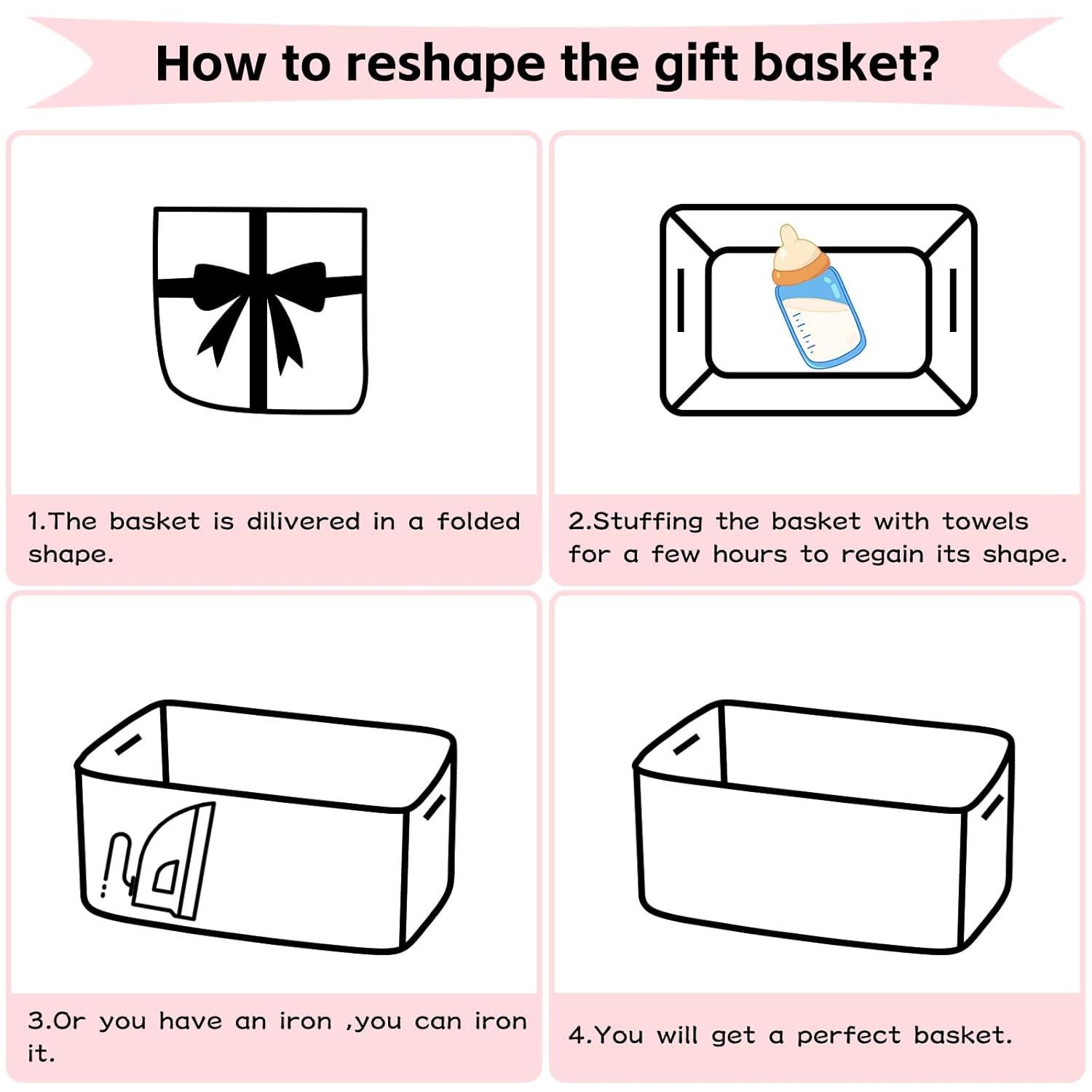 Convenient recovery process: The small baskets for gifts is folded when arriving. After receiving the basket, you can easily open it and place towels or clothes to regain its shape. If you have an iron at home, ironing can also help the cute storage basket recover to its best condition faster