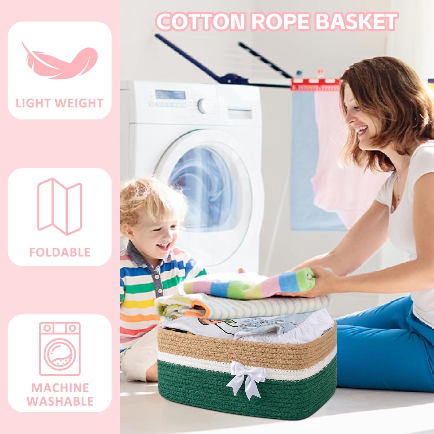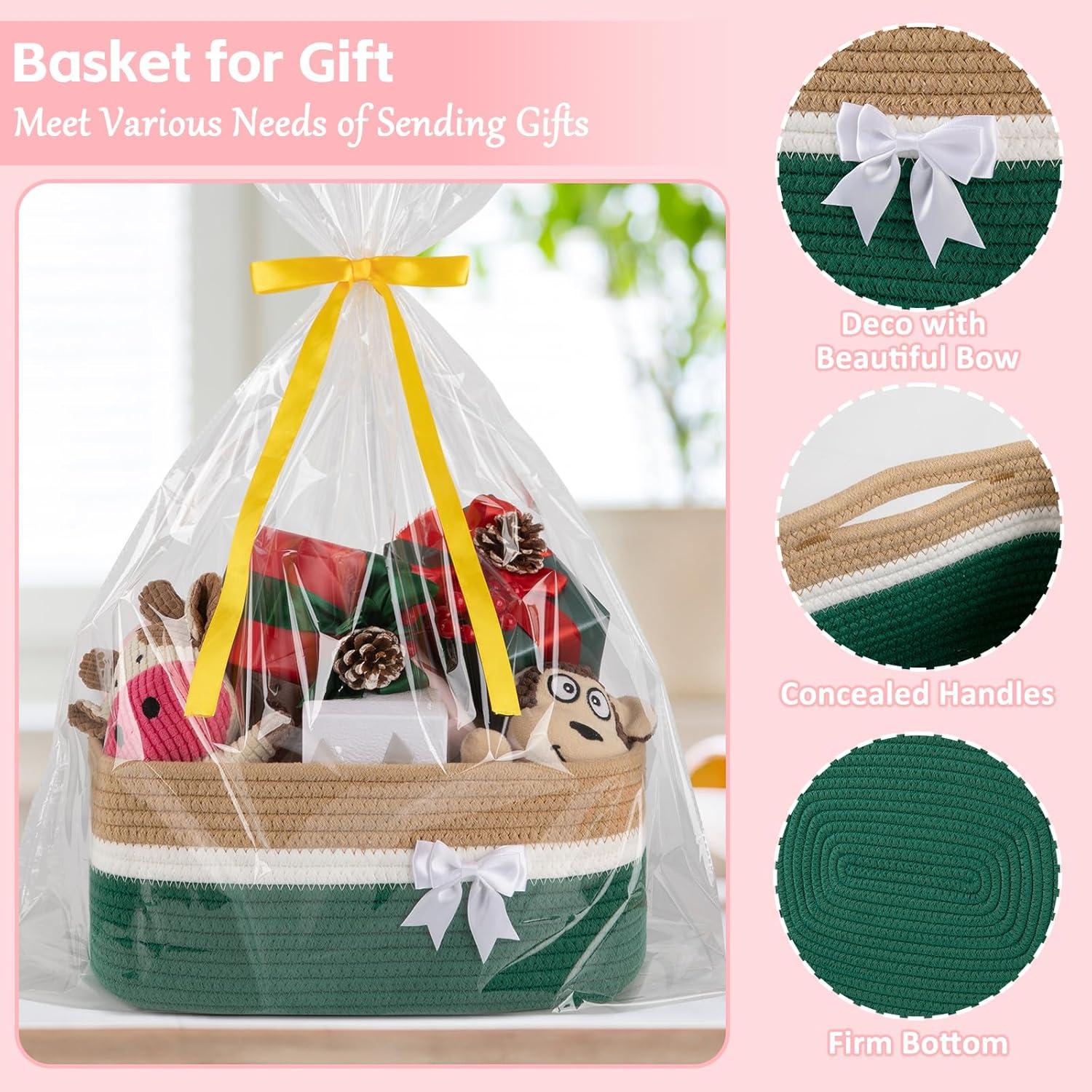 OIAHOMY Christmas Basket with Gift Bags and Ribbons, Woven Storage Basket for Decorations, Nursery, Pets – Green(Yellow & Dark Green)