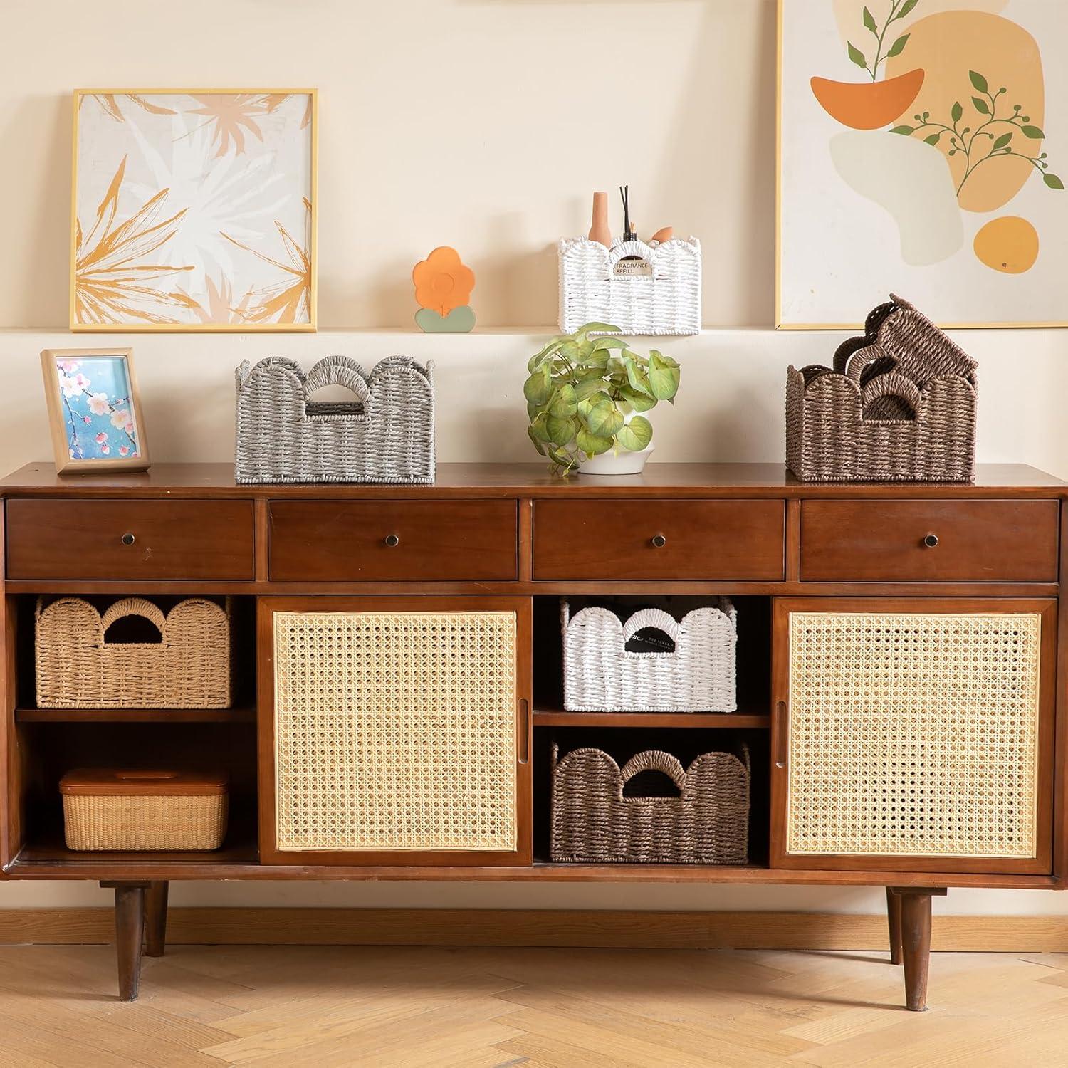 The wicker basket is woven from high-quality paper rope material and a sturdy metal frame. The paper material ensures the scalloped storage basket is environmentally friendly, while the tight weaving method and metal frame ensure the stability of the shelf basket
