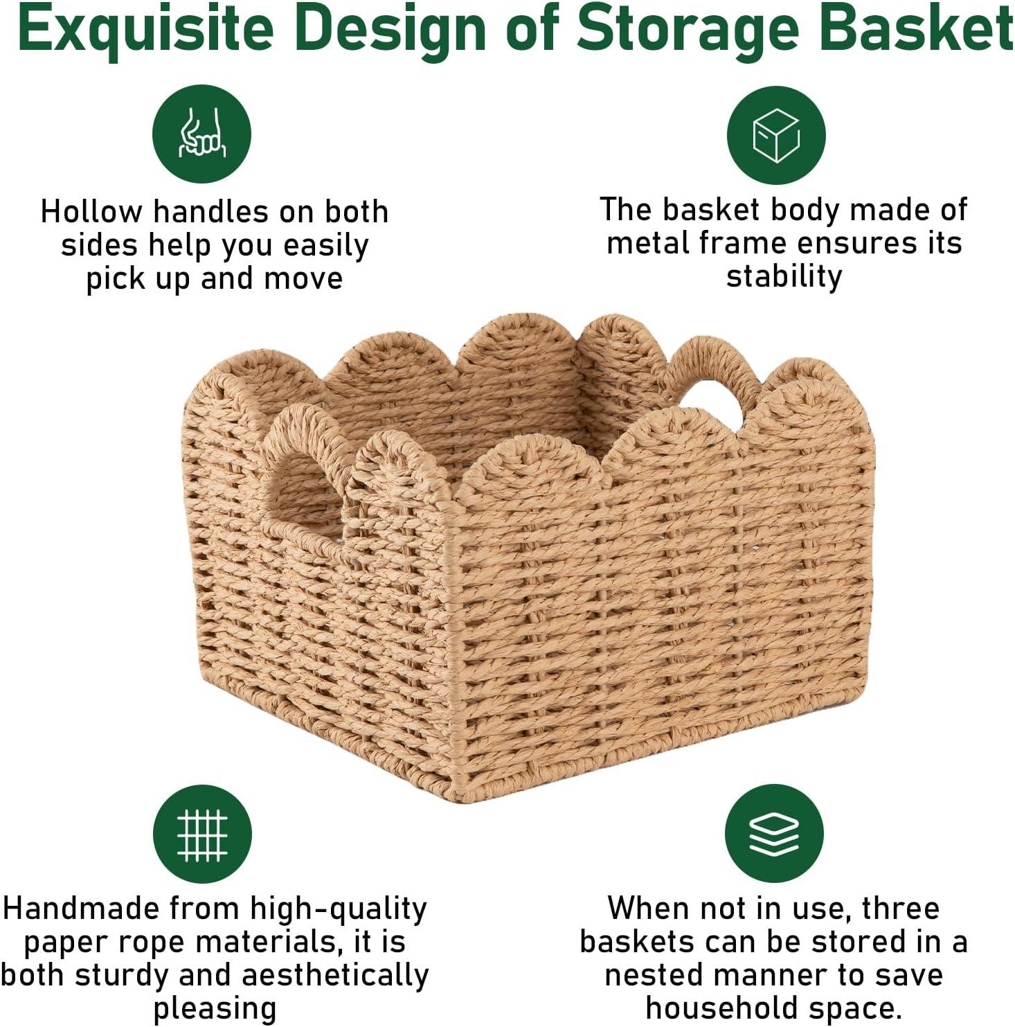 OIAHOMY Scalloped Wicker Baskets, Hand-woven Storage Baskets with Built-in Handles, Paper Rope Shelf Baskets for Organizing and Decoration, Set of 3-Yellow(Yellow)