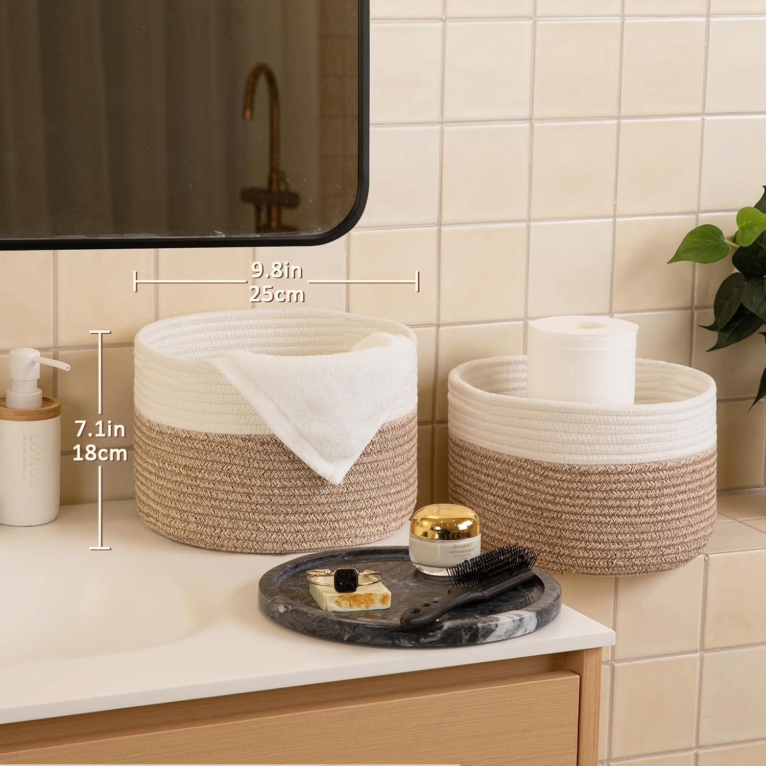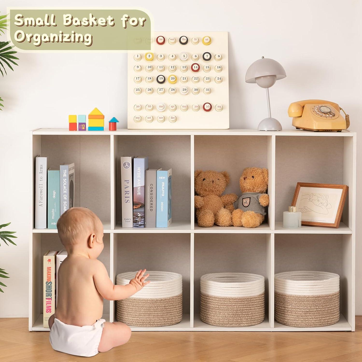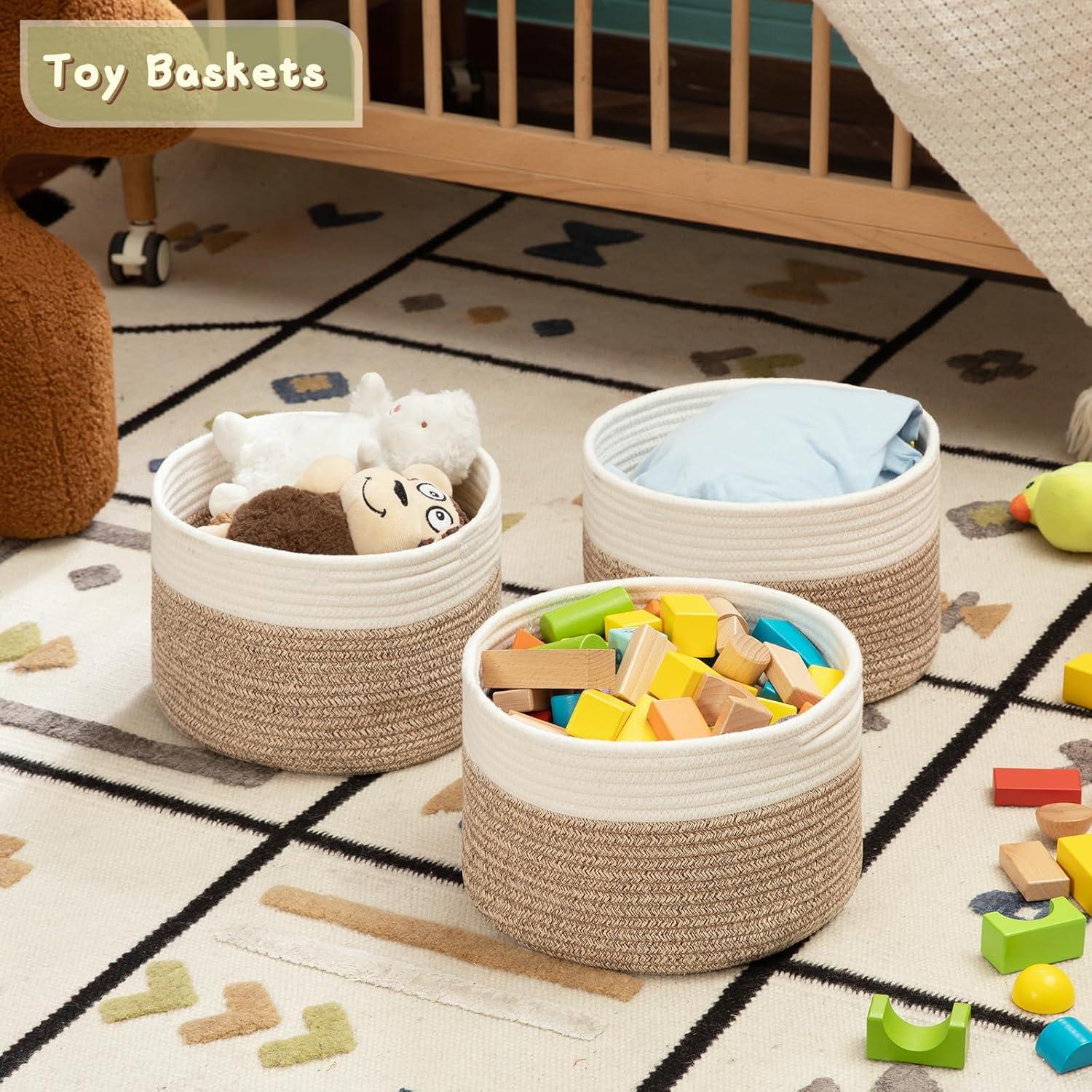 OIAHOMY Small Storage Baskets for Organizing,Closet Cube Shelf Storage, 9.8”×9.8”×7.1”, Woven Cotton Rope Gift Baskets for Nursery,Cute Dog Toy bins, Round 3 Packs, White(White & Brown)