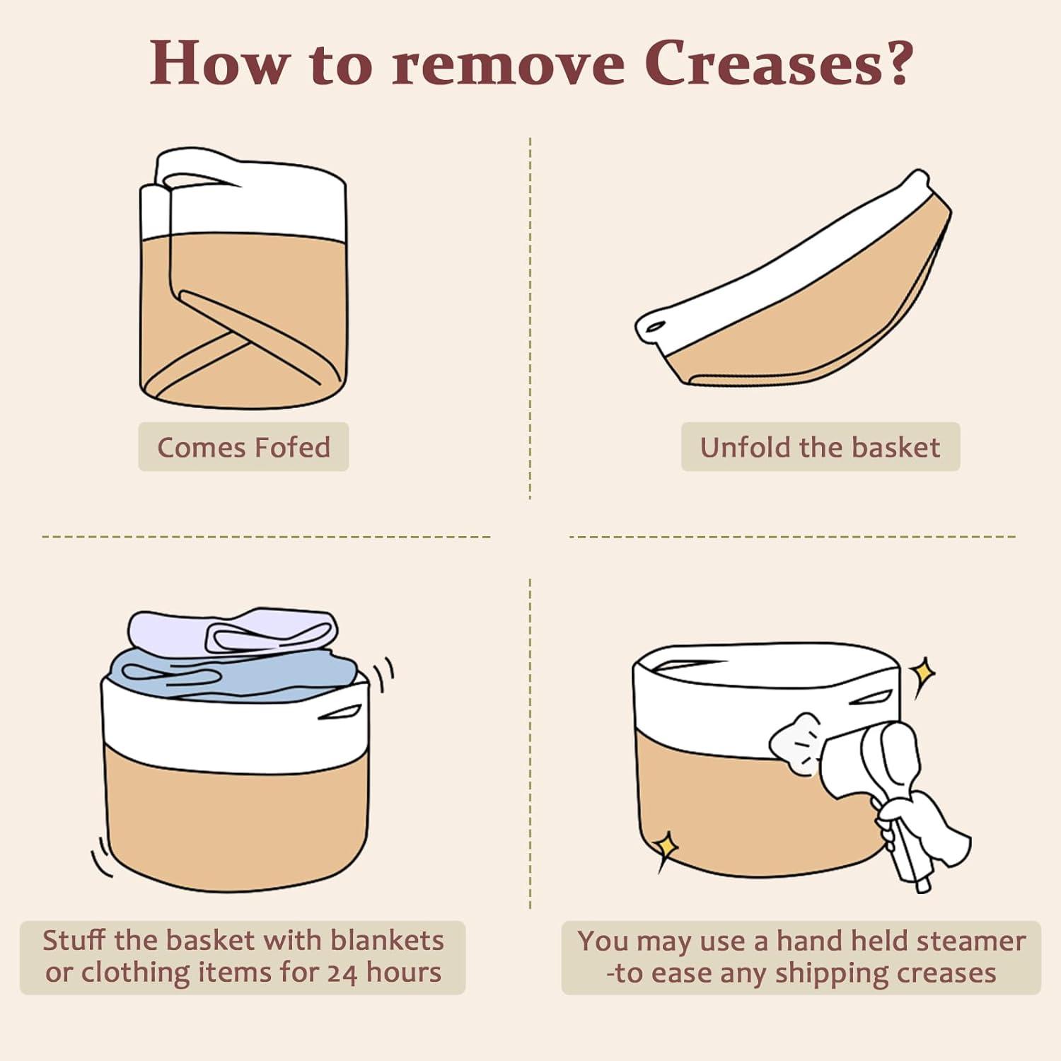 NOTE: The home woven storage basket is folded when shipping, it will turn back to its elegant shape quickly when you fill in some towels or clothing , and also iron is a good idea (However, the bottom cannot be ironed and washable)