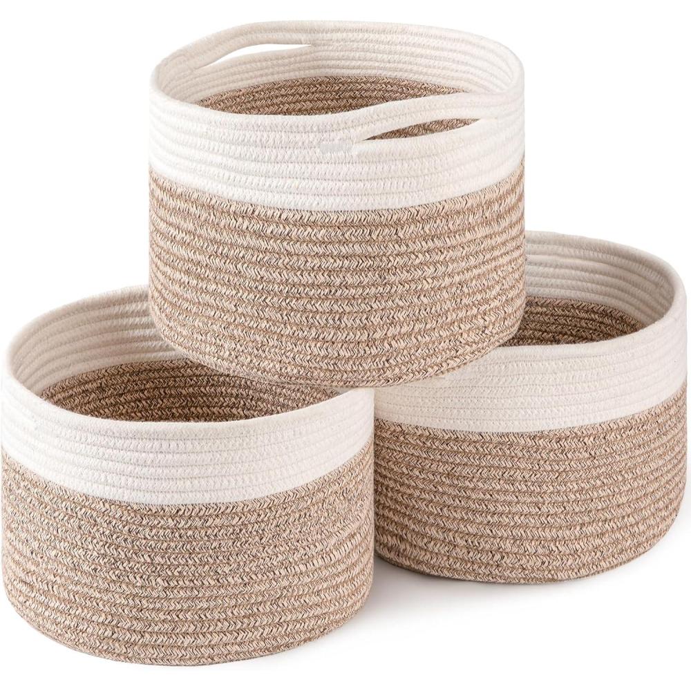 imageOIAHOMY Small Storage Baskets for OrganizingCloset Cube Shelf Storage 989871 Woven Cotton Rope Gift Baskets for NurseryCute Dog Toy bins Round 3 Packs WhiteWhite  Brown