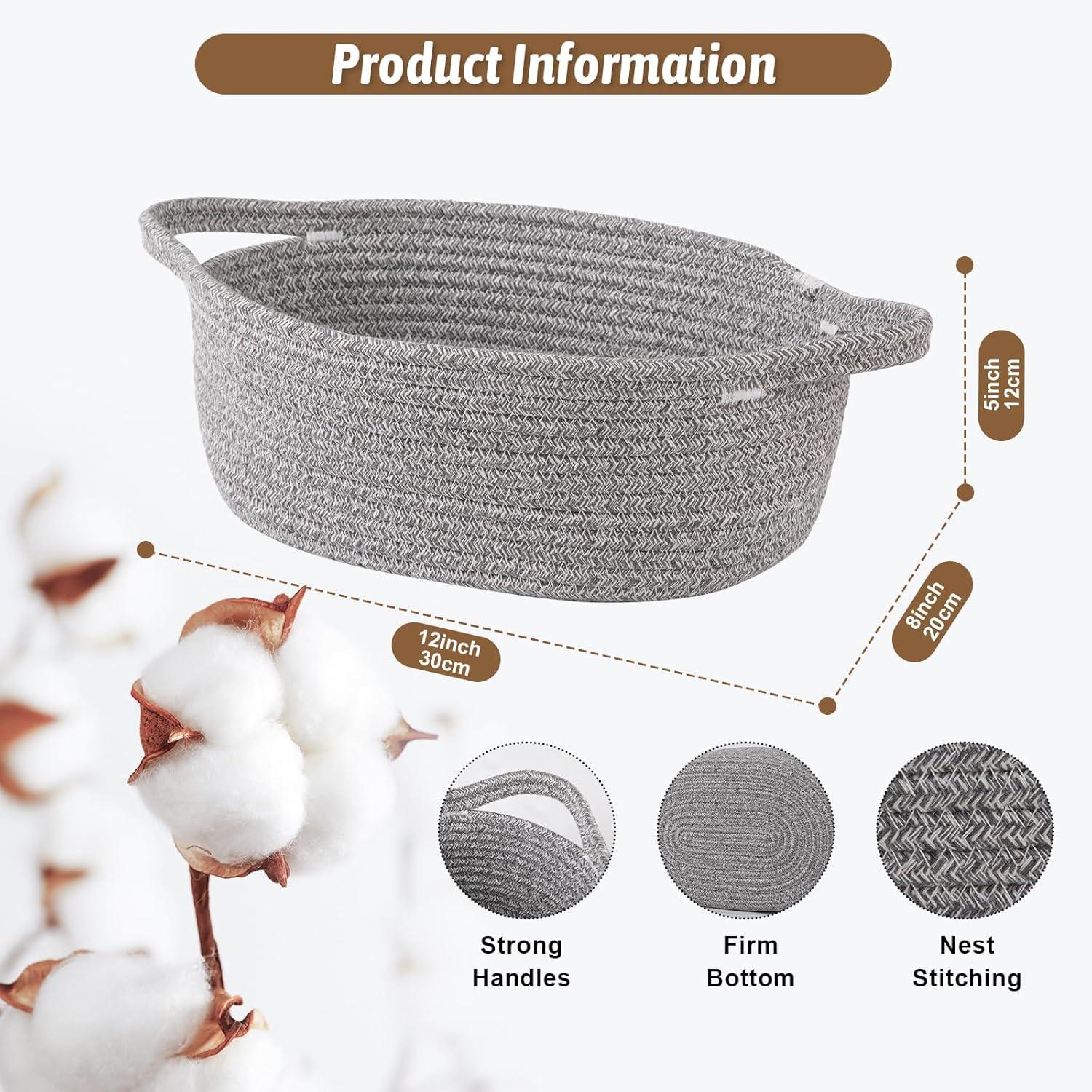 Wide Use Basket: 12*8*5IN. The small rope basket can hold many of the items scattered in the room and keep the room organized. Widely used in living room, bedrooms, bathrooms, kids Room and vanity tables. Our cute basket, keep fruits, remote control, towel, diaper, toy, nursery necessaries, make-ups organized in order. Even can be used as dog toy basket