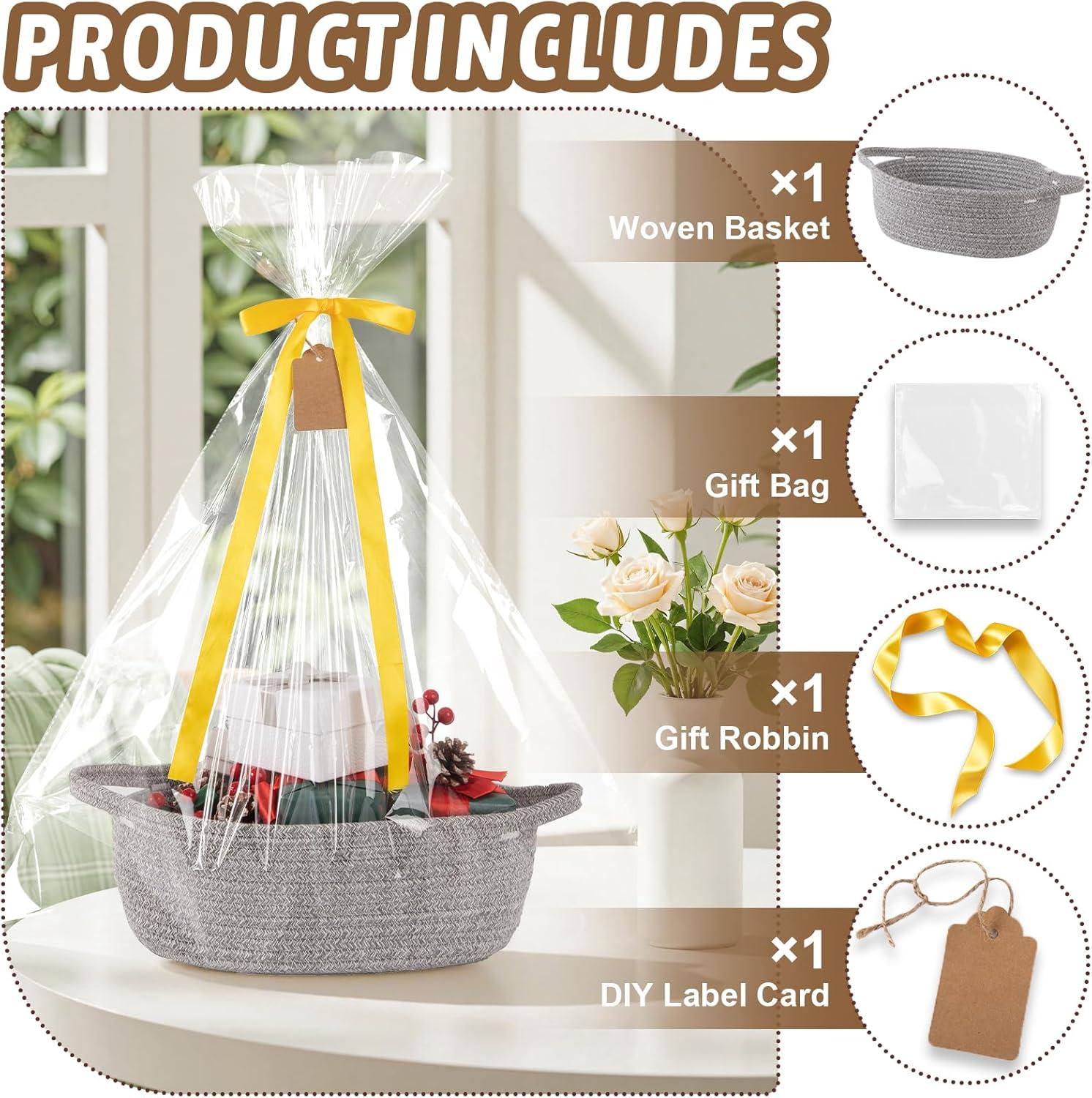OIAHOMY Small Woven Basket with Gift Bags, Ribbons & DIY Label Card, Baskets for Gifts Empty, Small Rope Basket 12 * 8 * 5IN, Cute Decorative baskets with Handles for Baby Pets, Toys, Green(Grey)